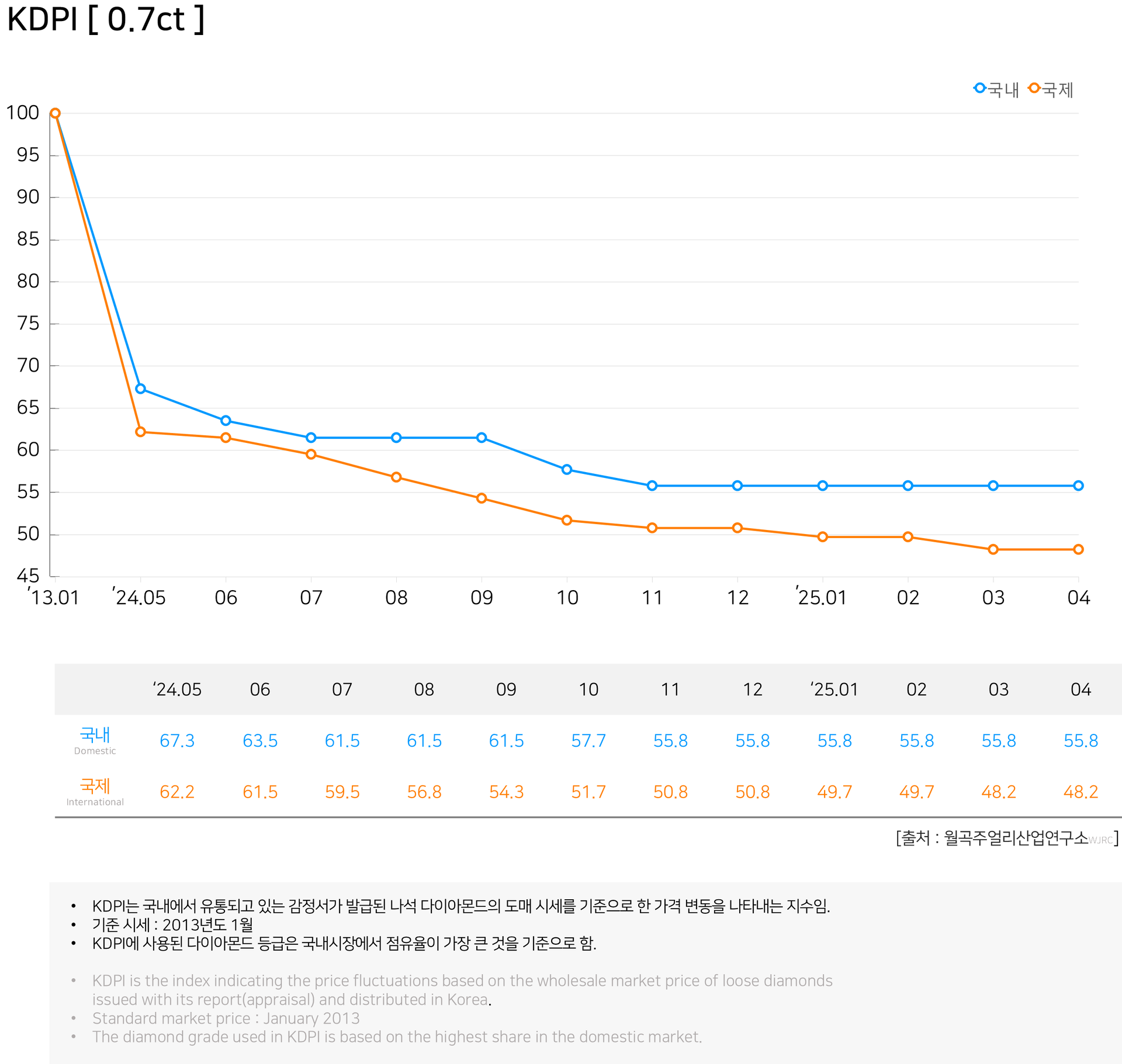 국내에서 유통되고 있는 감정서가 발급된 나석 다이아몬드의 도매시세를 기준으로 한 가격 변동을 나타내는 지수이다. 한국 다이아몬드 가격지수(Korea Diamond Price Index, 이하 KDPI)는 세계 다이아몬드 시장 및 국내 다이아몬드의 수요와 밀접한 관련이 있다. 이에 월곡주얼리산업연구소는 복수의 다이아몬드 유통 업체를 임의 선정하여 각각 제공하는 시세의 증감률을 토대로 표준 기준을 만들었다.