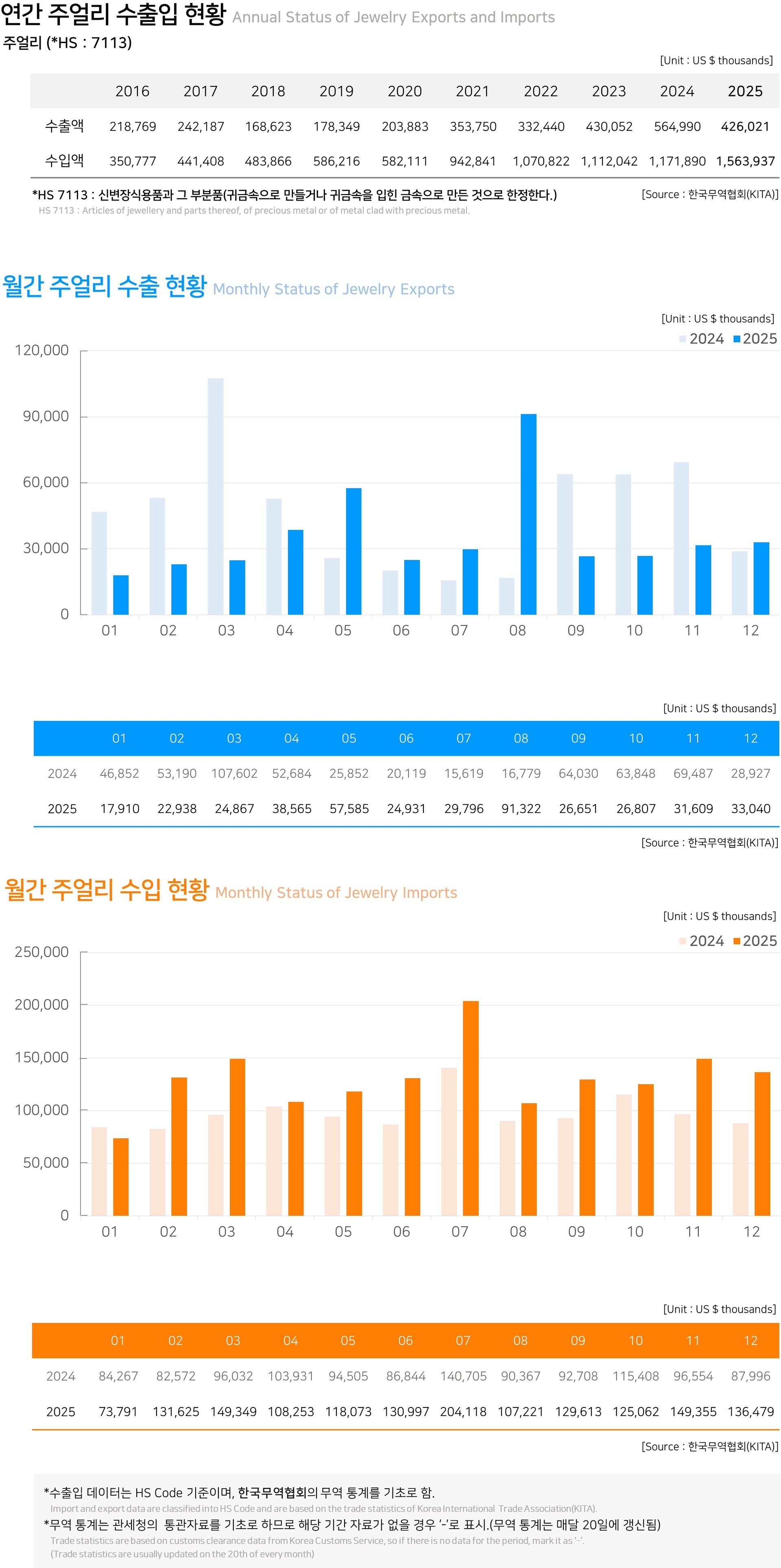 매월 제공되는 HS 코드로 분류된 수출입 실적에 따라 주얼리 관련 자료인