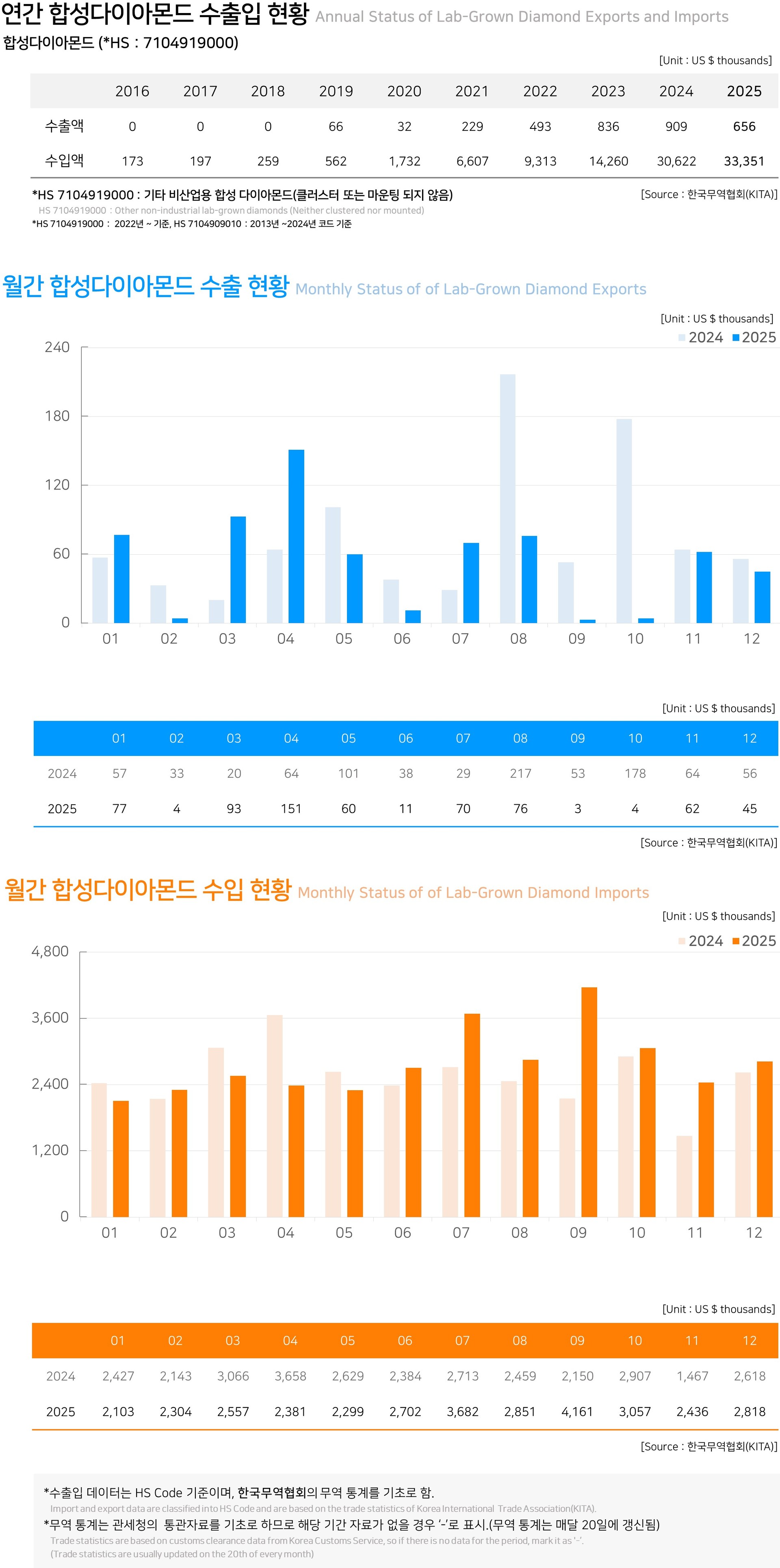 주얼리, 금, 은, 플래티넘, 다이아몬드, 합성 다이아몬드, 유색석, 진주, 모조 신변장식용품의 수입과 수출 금액 통계를 정리했다.