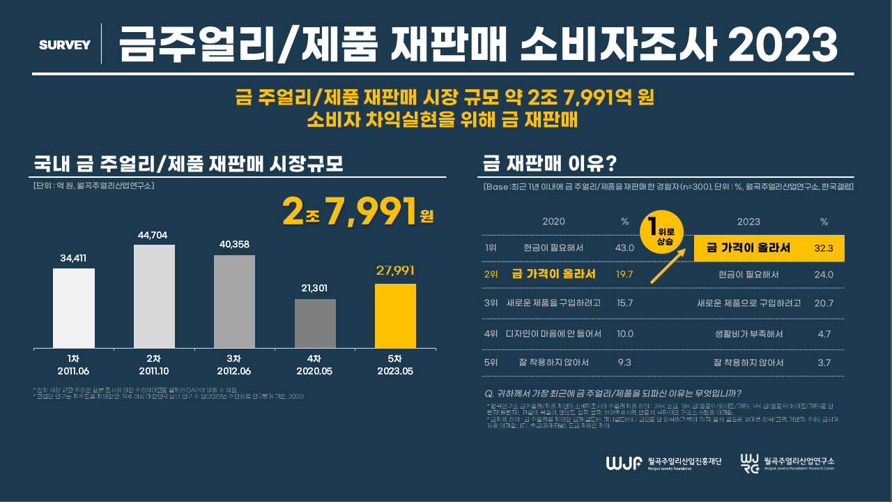 국내 소비자의 금 주얼리/제품 재판매 시장 규모는 약 2조 7,991억 원으로 추정되며, 이는 11년 전 조사 대비 -30.6% 감소했다. 반면, 치솟은 금 값의 영향으로 1회 평균 재판매 가격은 1백59만 원으로 조사 이래 최고치를 기록했다.