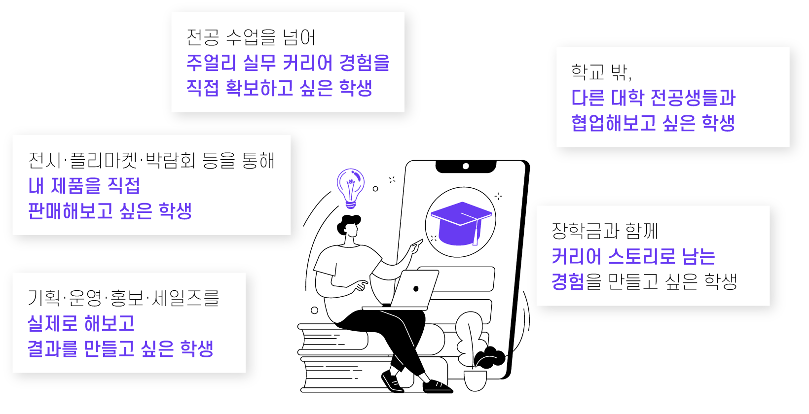 · 개인 또는 팀 참여· 마켓 직접 발굴· 판매 전략 수립 · 판매 성과 기반 평가 및 성과형 장학금 연계