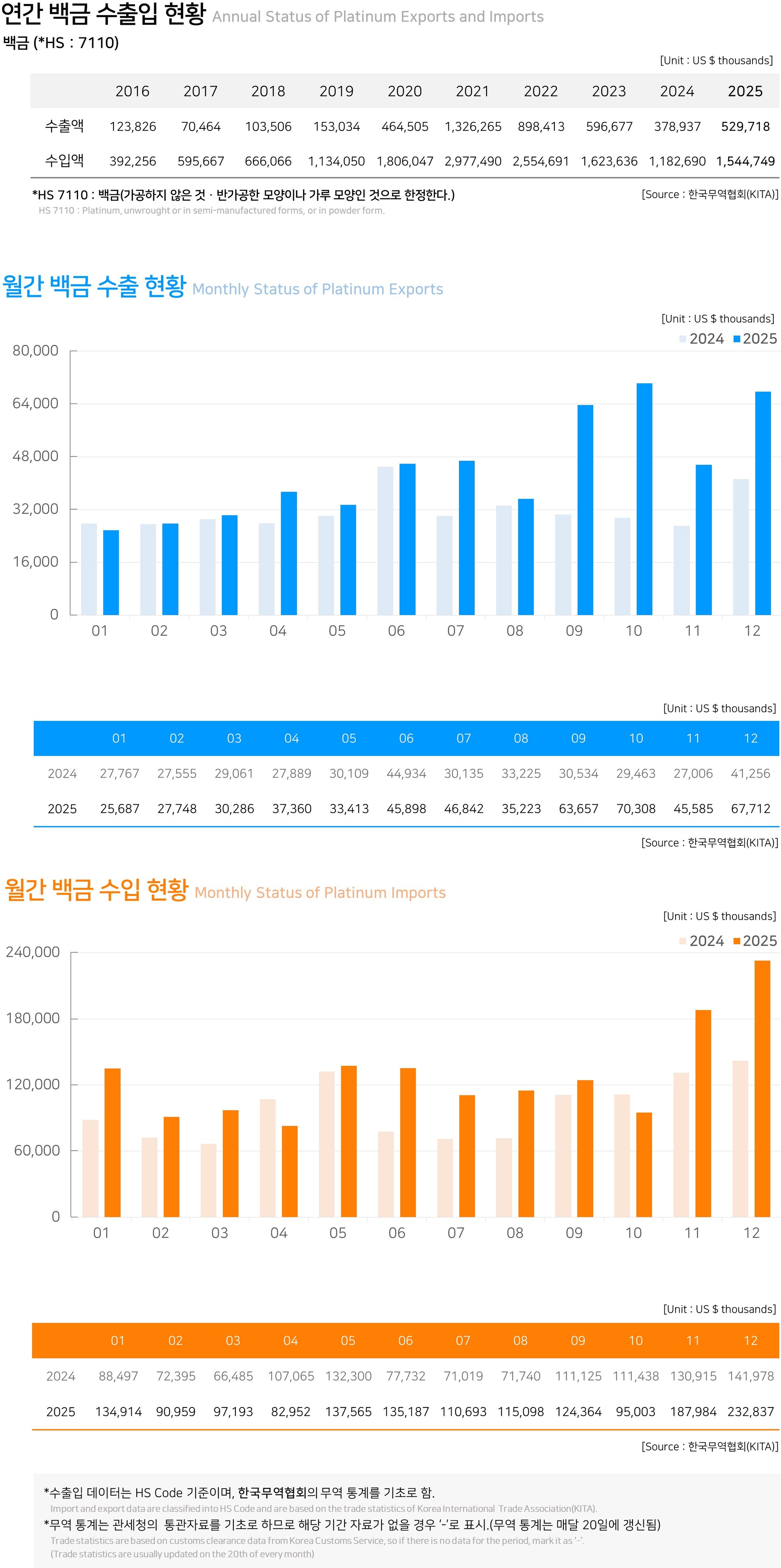 주얼리, 금, 은, 플래티넘, 다이아몬드, 합성 다이아몬드, 유색석, 진주, 모조 신변장식용품의 수입과 수출 금액 통계를 정리했다.